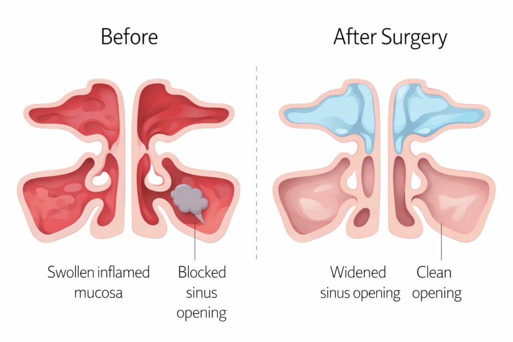 Sinus surgery (often endoscopic sinus surgery / FESS) improves drainage and ventilation. It also allows medication to reach deeper into the sinuses. But surgery is not a “once-and-done cure” for many people with chronic rhinosinusitis.